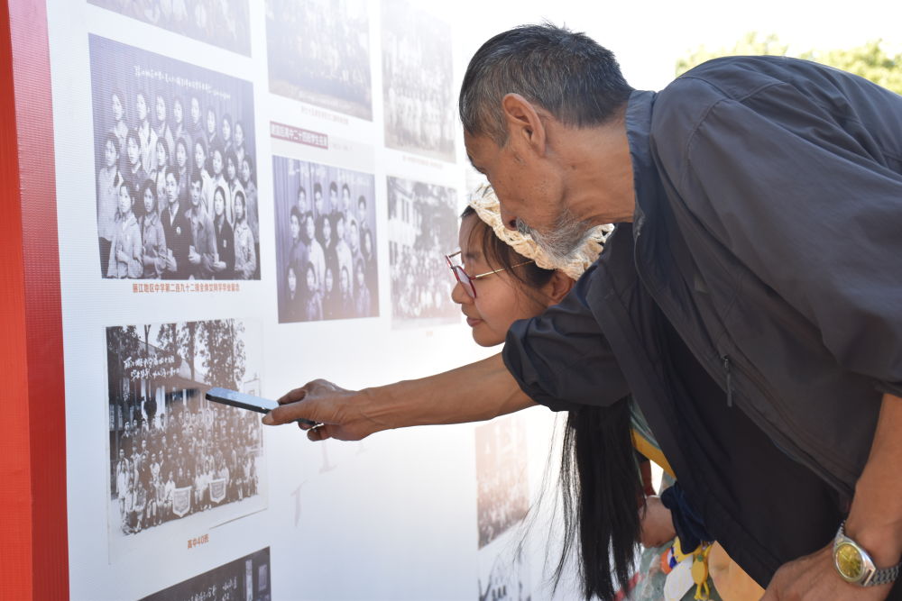 老校友在“时光长廊”照片墙中找出自己。(丽江融媒记者 杨四娟 摄)