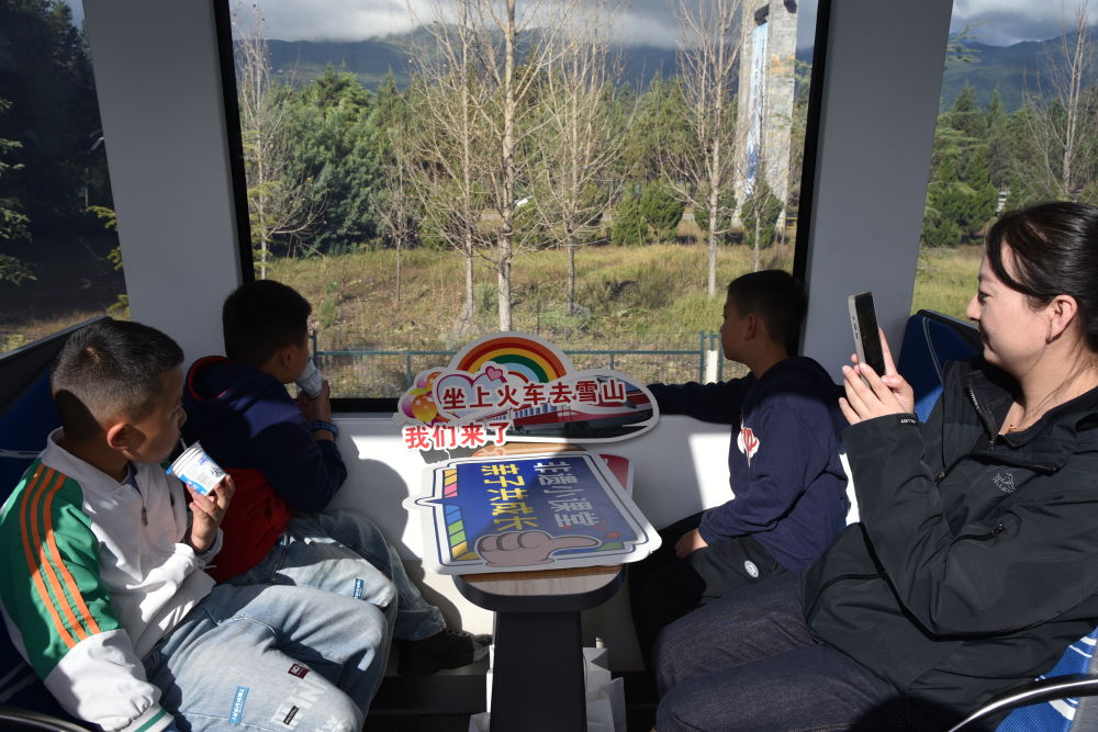 亲子家庭乘坐丽江雪山观光火车,欣赏玉龙雪山轨道沿线旖旎风光。(丽江融媒记者 段玉菊 摄)