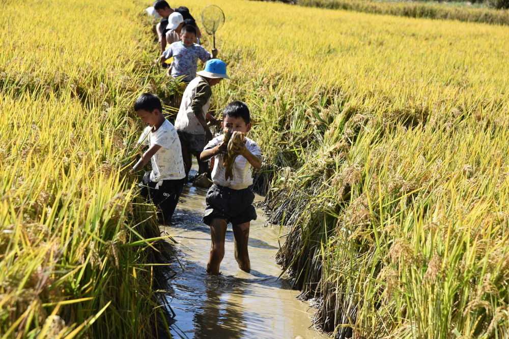 亲子家庭前往九河稻田鱼实践基地体验抓稻田鱼。(丽江融媒记者 段玉菊 摄)