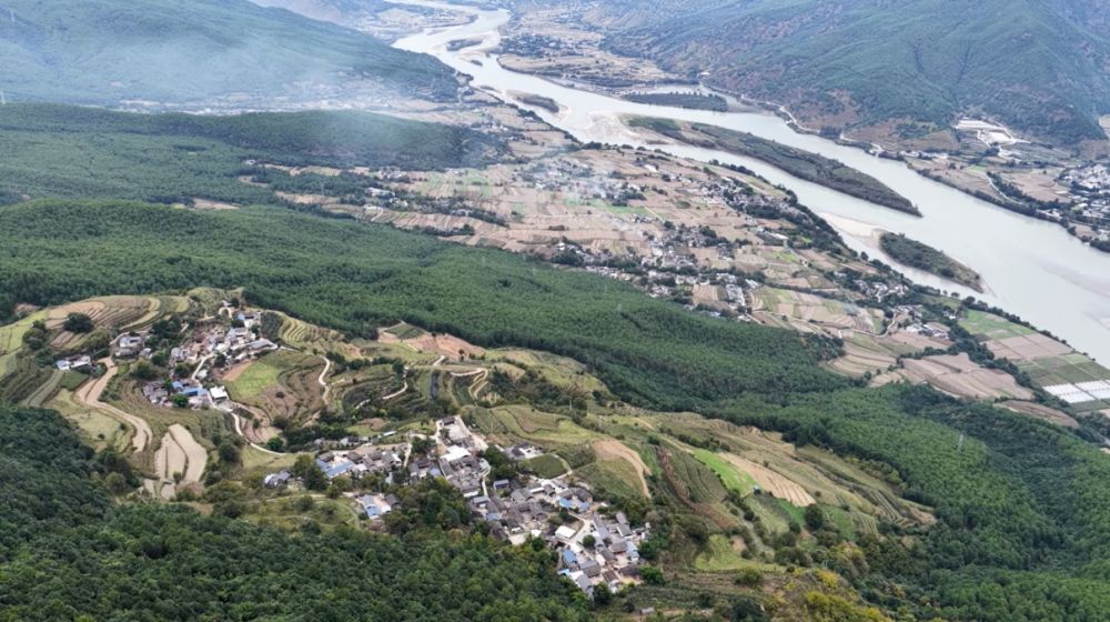 俯瞰石鼓镇四兴村,四周绿树环绕,满目葱茏。(丽江融媒记者 赵凤铭 摄)