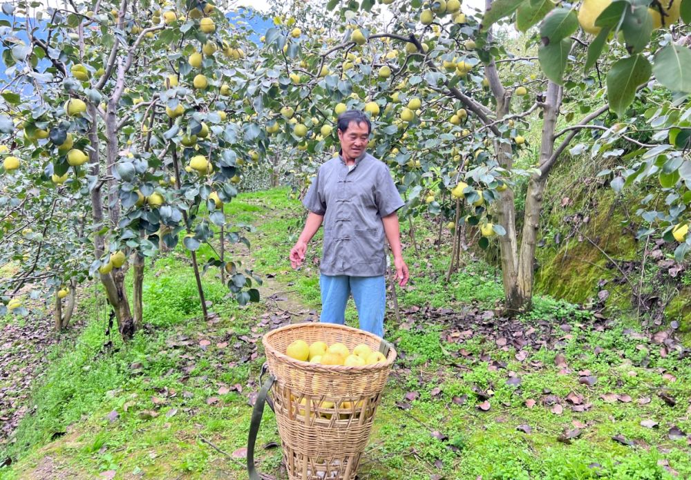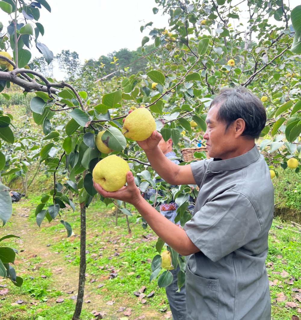 渐渐地,看到杨文学和他的兄妹们都有了收益,越来越多的村民加入到了酥梨种植的行列。他们充分利用当地充足的光照、适宜的水土等地理条件优势,在村内坡地和房前屋后种植酥梨。如今,四兴村新民小组42户村民均都种有酥梨,不止如此,杨文学还带动了周边村组的村民一起种植。目前,全村酥梨种植面积已达370余亩,其中挂果面积约300亩,酥梨产业已成为了当地的致富产业。