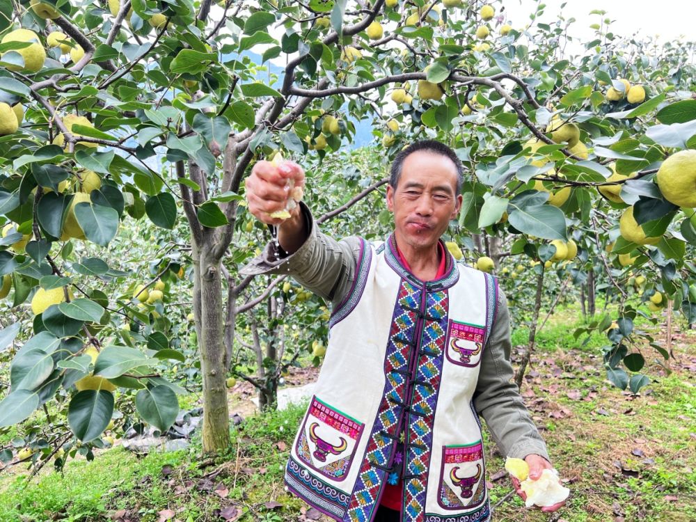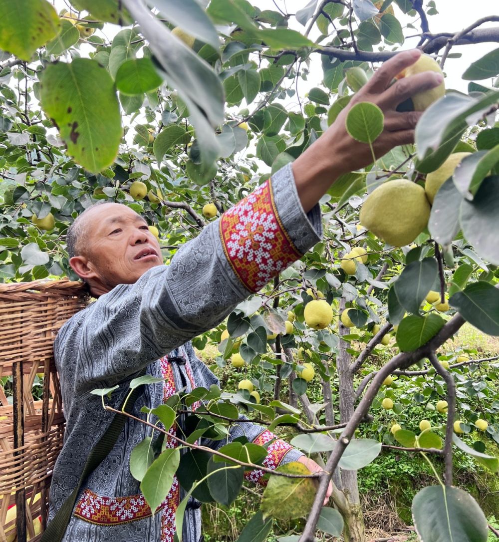 暮秋时节,玉龙县石鼓镇四兴村新民小组的酥梨园里,一个个沉甸甸的酥梨压弯了枝头,空气中弥漫着甜蜜的果香。这里的酥梨不仅是舌尖上的美味,更是当地苗族群众的“摇钱树”,而这一切,都离不开一个人——杨文学。