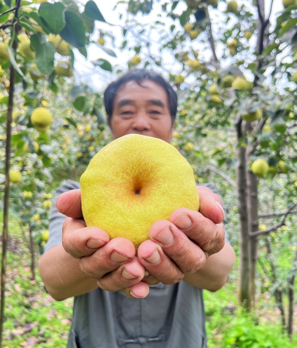 此时的四兴村梨园里,村民们正有序地采摘、分拣,收储酥梨,大家忙得不亦乐乎。杨文学顺手摘下一颗黄澄澄的酥梨,指尖轻掐便渗出水珠,“你尝尝,这甜度比当年第一茬果子好多了!”话音未落,咬开的酥梨已溢出清甜汁水。