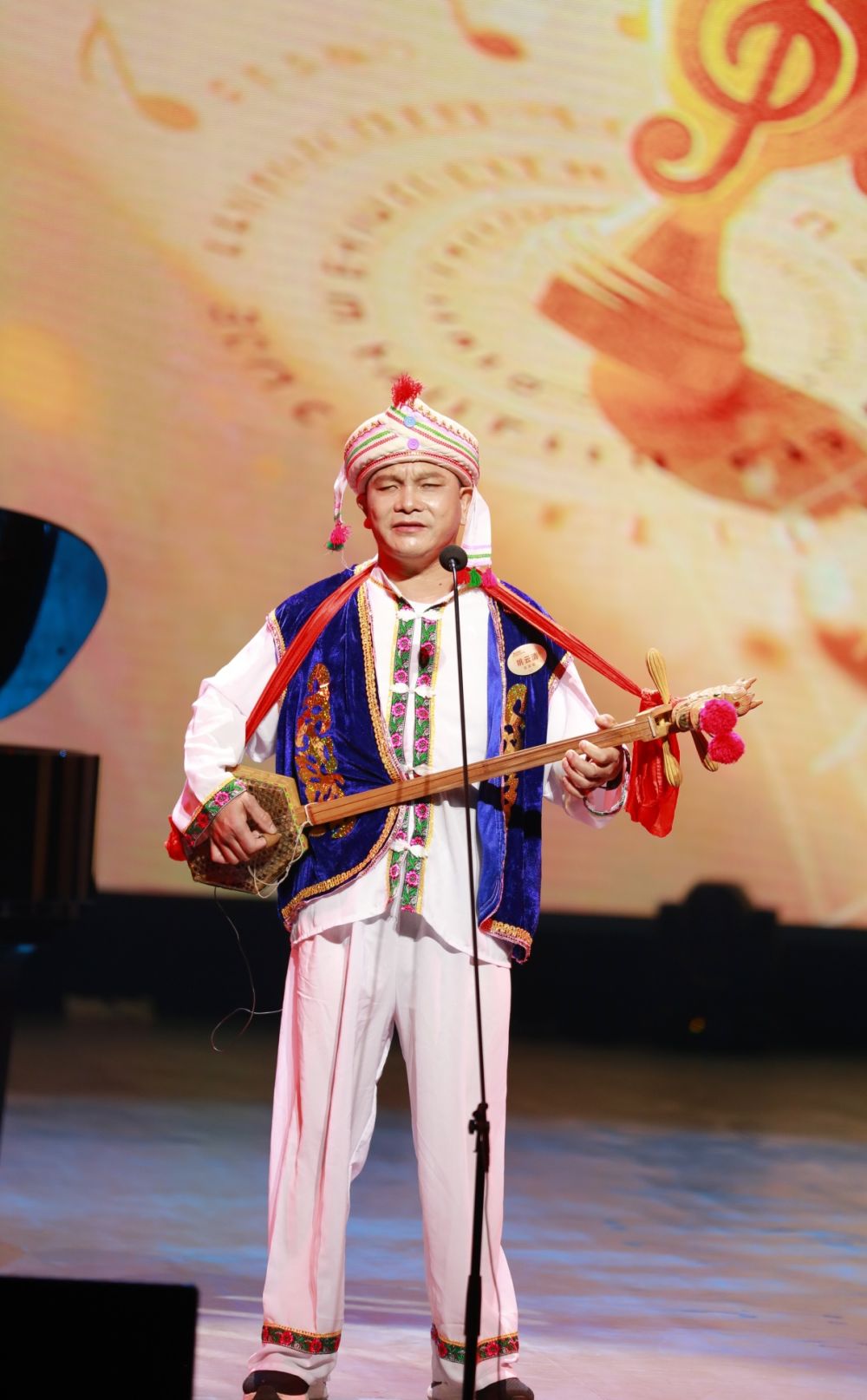 10月14日,姚云清在“看见明天”第六届盲人歌手大赛上弹三弦唱白族调。(丽江融媒记者 曾润民 摄)