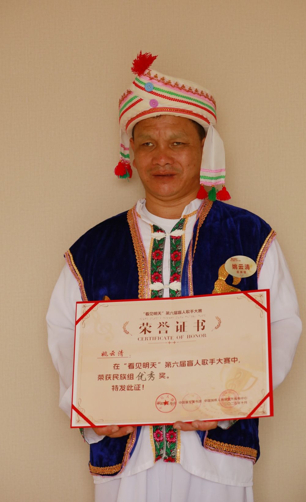 平时每月生活费不超过600元的他,特意花了160元买了一套白族服装。站在云南省盲人歌手大赛的舞台上,姚云清看不见炫目的灯光,但自信的弹唱赢得了全场掌声,最终荣获民族组三等奖。