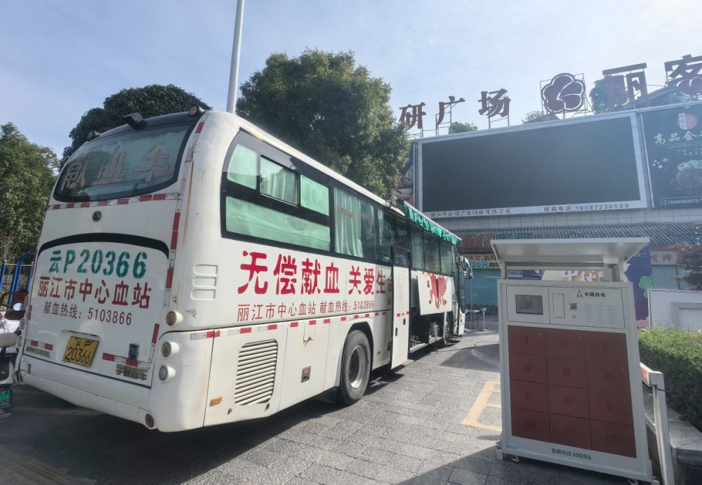 献血车停靠在丽江市大研广场。(丽江融媒记者 侯玮 摄)