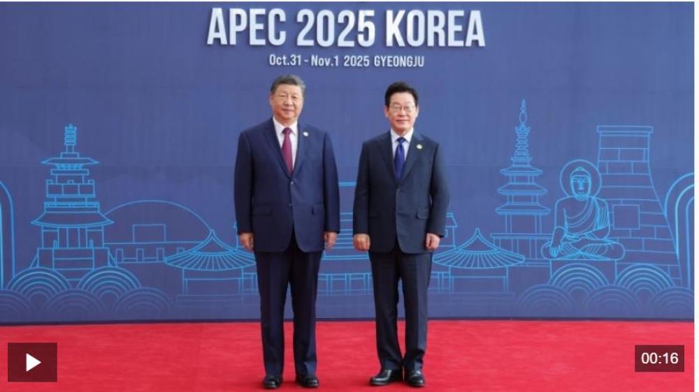 习近平主席抵达时,韩国总统李在明热情迎接。两国元首握手、合影,留下珍贵的“APEC瞬间”。随后,两位领导人微笑交谈,共同步入会场。