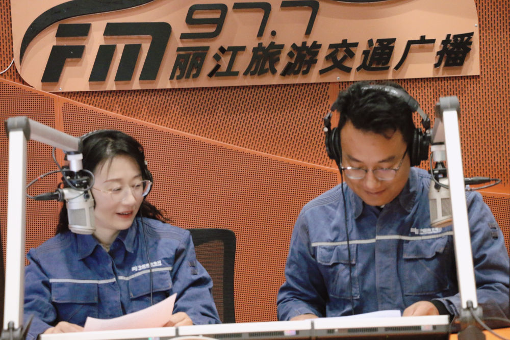 11月4日,丽江供电局市场营销部(客户服务部)经理和耀星(右)、丽江供电局市场营销部(客户服务部)业扩报装专责王兴(左)做客FM97.7直播间。(丽江融媒记者 杨超 摄)