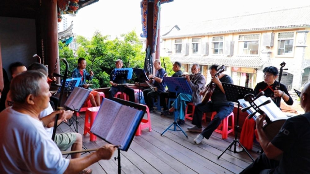 清晨八点,金马坊古戏台前,63岁的祁家福带着民乐队奏响《众手浇开幸福花》,悠扬旋律引得路人驻足拍手。“以前没固定场地,队员凑不齐,在小区练习还怕吵到邻居,大家都没干劲。”祁家福笑着说。自金马坊改造后,古戏台成了民乐队的“专属排练室”,配套设施一应俱全。六年来,乐队从“不识简谱”到能演数十首曲目,还常登全县汇演舞台。如今的金马坊,非遗展演、民俗活动轮番上演,老街区成了居民的“文化客厅”,日子过得有滋有味。