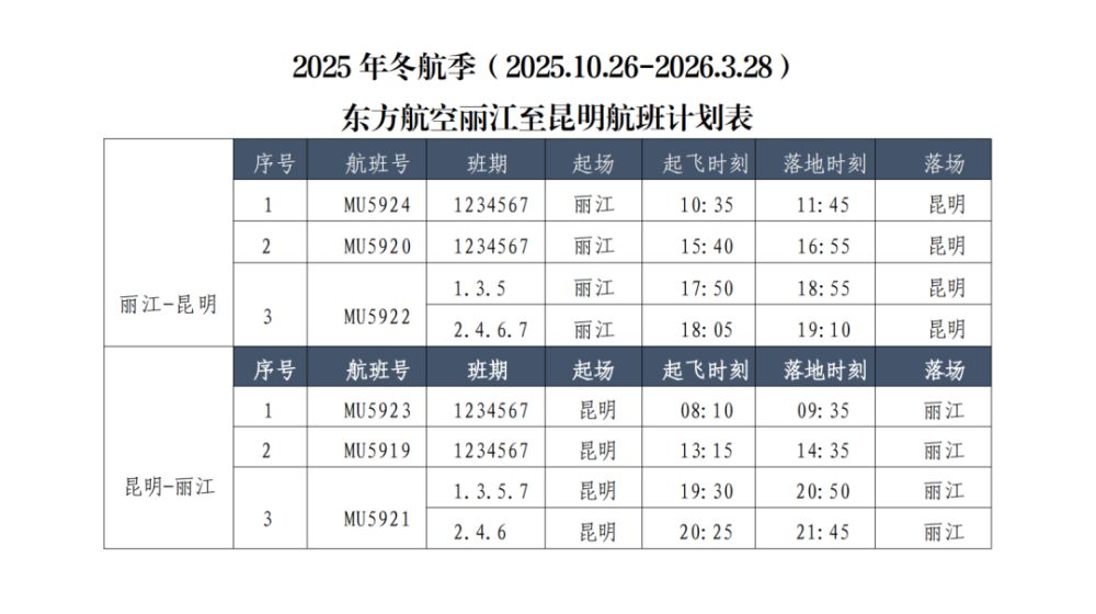 丽江机场2025年冬航季丽江⇄昆明航班计划表。(供图)