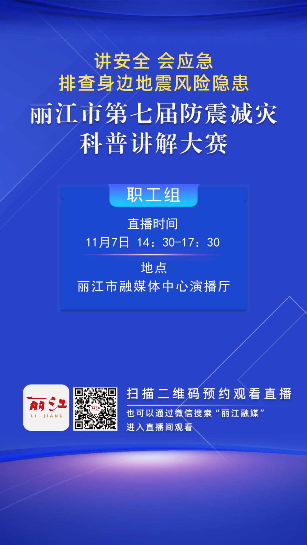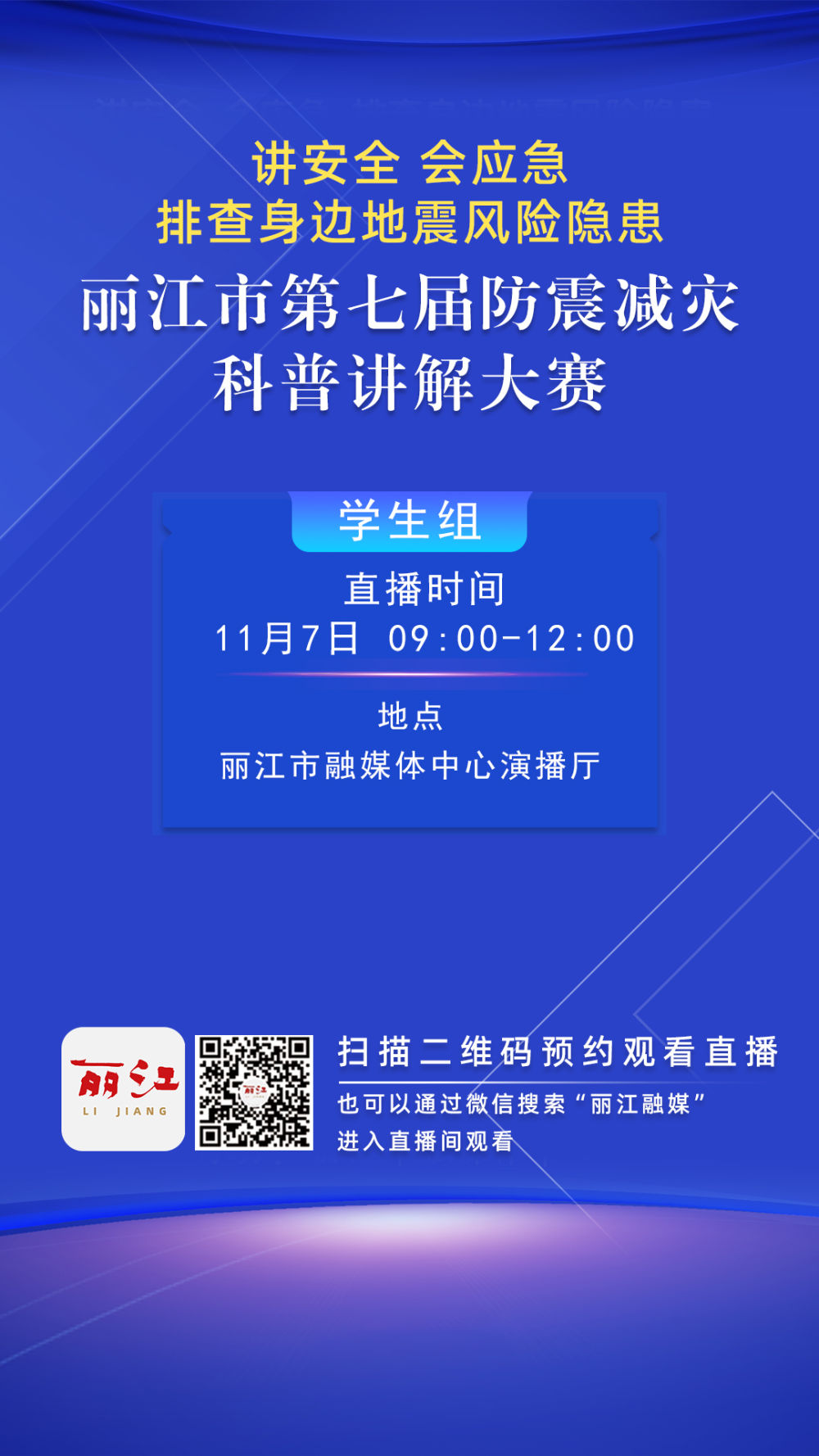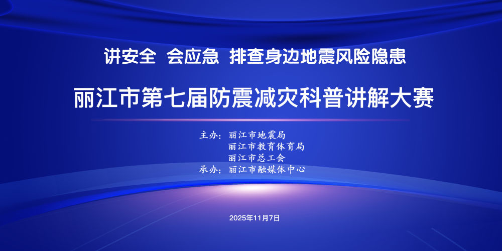 “讲安全 会应急 排查身边地震风险隐患”——丽江市第七届防震减灾科普讲解大赛将于11月7日(周五)在丽江市融媒体中心演播厅举行。