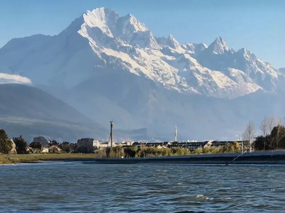 云雾如羞涩面纱,不肯轻易展露十三峰真容。冬日晴空之下,雪山轮廓愈发壮观,积雪覆盖让山体纹理清晰分明,黑白交错间棱角刚毅,宛如静卧的玉龙,在阳光下闪烁凛冽银光。