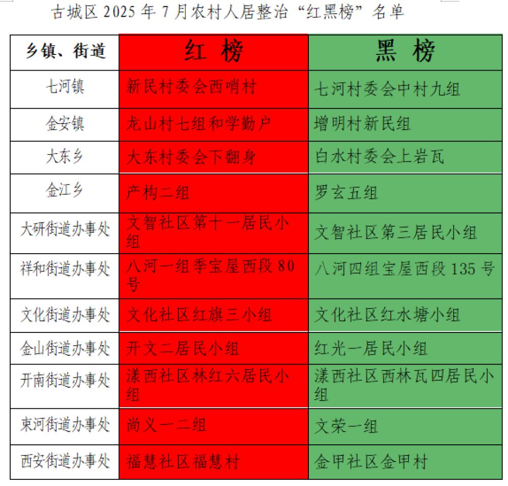 各乡镇、街道要对上“红榜”的村(居)民小组进行适当表彰奖励(特别是对该村做得好的农户,要结合“爱心超市积分制”给予奖励),积极组织开展“红榜”村庄观摩交流活动;对上“黑榜”的村(居)民小组发放整改通知,并及时跟踪督查,限期整改落实。经各乡镇、街道自查和区农村人居办复核,现将2025年7月农村人居环境整治“红黑榜”名单公布如下: