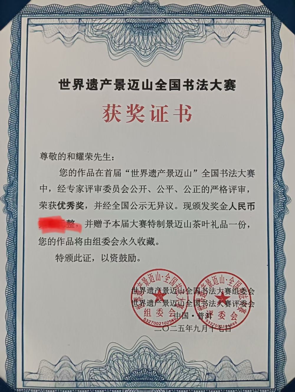 日前,首届“世界遗产景迈山”全国书法大赛获奖及入选名单揭晓,丽江市书法家协会主席和耀荣的书法作品荣获优秀奖。