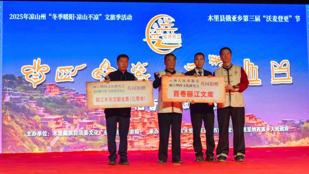 丰收节庆典上,云南人民出版社、丽江纳西文化研究会、滇西映雪轩·史料研究中心联合向俄亚乡捐赠《丽江木氏文献全集》(3卷本)、百卷《丽江文库》等文献资料。丽江纳西族文艺工作者的经典歌曲演唱及新老款纳西族服饰模特秀,将文艺晚会不断推向高潮。