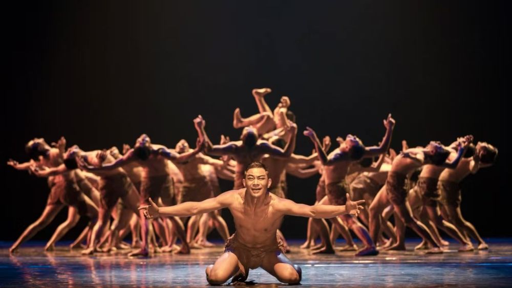 在这个充满力量和动感的作品里,有一个舞蹈段落显得格外静谧轻柔:舞者用身体构筑成一棵芭蕉树,芭蕉树旁出现了一朵漂亮的占芭花。领舞袁志平将它摘下,反哺大地,再重新捧起。