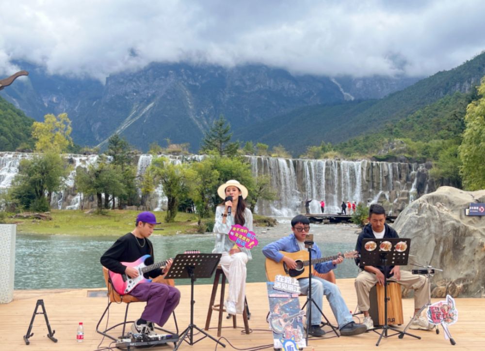 熊笑笑和她的乐队在蓝月谷景区路演。(丽江融媒记者 和丽菊 摄)