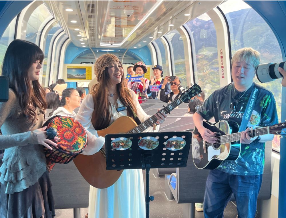 2025丽江民谣音乐季路演活动在丽江雪山观光火车内上演。(丽江融媒记者 和丽菊 摄)