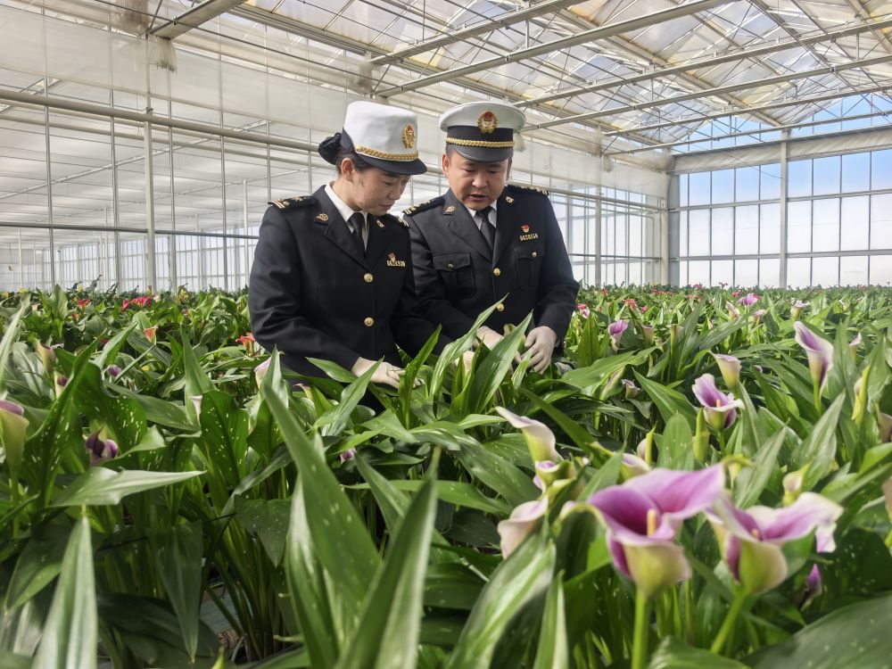 丽江海关关员正在花田中对马蹄莲进行细致查验。(丽江融媒记者 侯玮 摄)