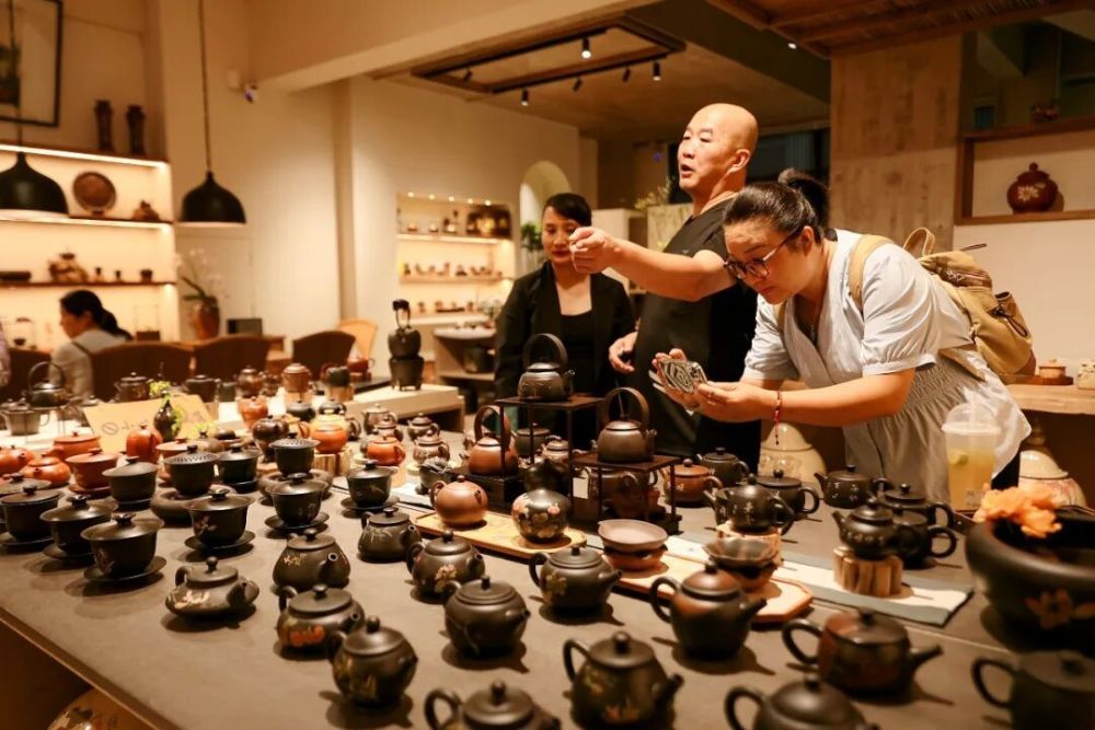 游客们或在店铺中欣赏紫陶艺术