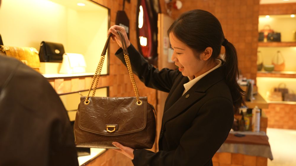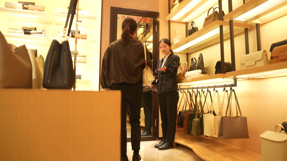 在HONGU红谷店内,顾客正在挑选包品。( 桑震宇 摄)