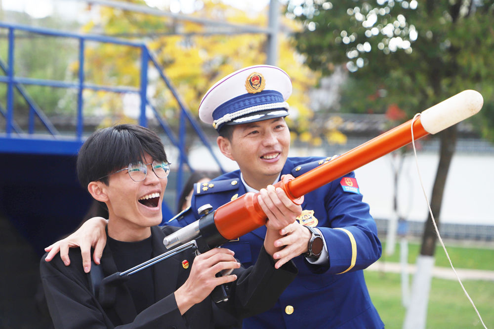 在装备展示区,高压细水雾灭火装置、救生抛投器、水域救援机器人等特种装备引得学生驻足。消防员赵永强逐一讲解装备性能与用途,并邀请同学们上手操作体验。一名学生在体验后感叹:“原来风力灭火机不仅能灭火,还能用来清理隔离带。”训练场上,消防员现场演示了200米灭火障碍、抗眩晕训练等科目,他们矫健的身手和过硬的技术赢得阵阵掌声。部分学生在消防员的保护下,尝试通过独木跨桥等障碍设施,亲身体验训练的艰辛与不易。