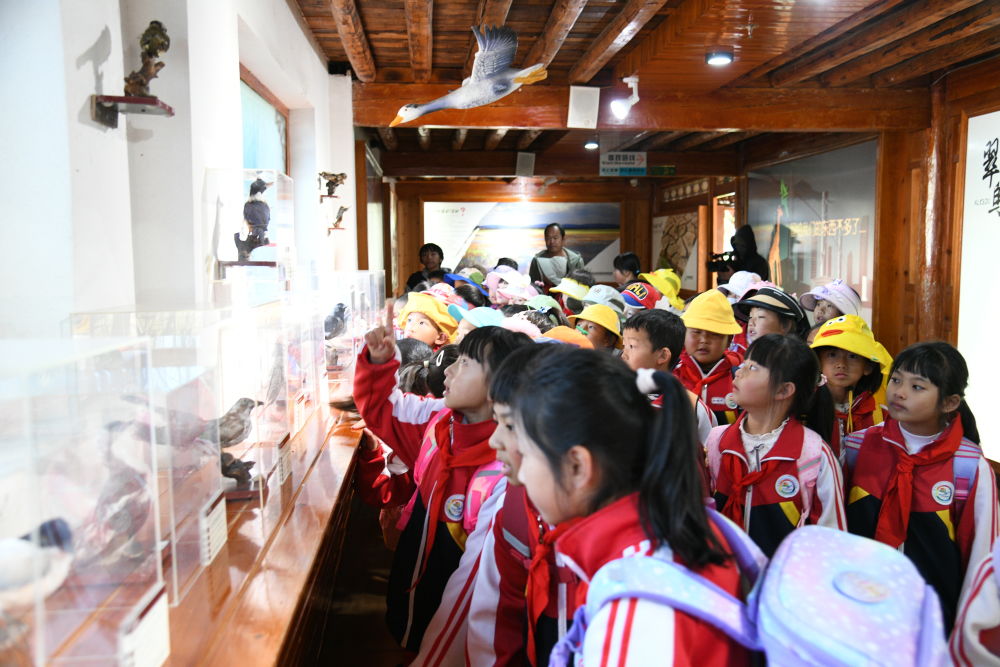在丽江拉市海湿地博物馆内,学生们认真观看各类候鸟标本,聆听讲解员介绍候鸟生活习性及湿地生态系统重要性。生动的讲解引发阵阵惊叹,“我知道东方白鹳为什么是国家一级保护动物了!”一名学生兴奋地分享着自己的收获。
