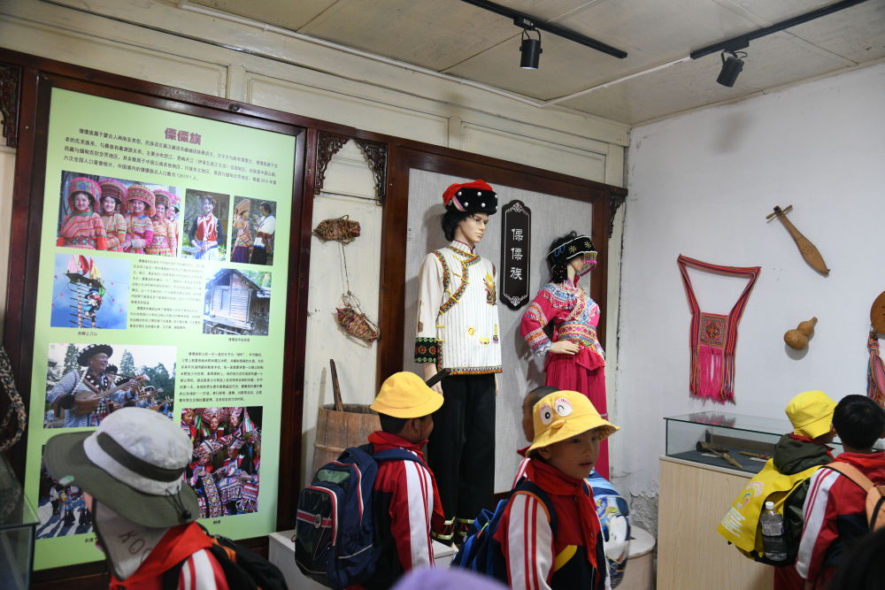 学生们在中国少数民族村庄纪念馆观赏民族服饰。(见习记者 和丽菊 摄)