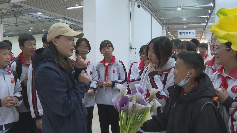 同学们参观鲜花展示区并认真聆听讲解。(丽江融媒记者 和继鹏 摄)