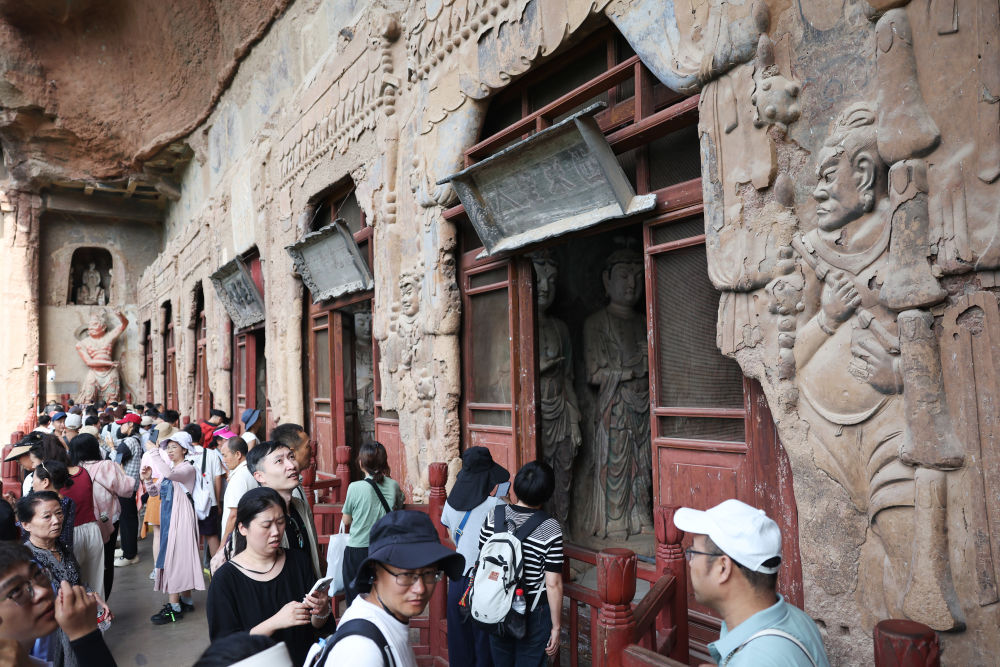 2024年9月4日,游客在敦煌莫高窟数字展示中心观看球幕电影《梦幻佛宫》。