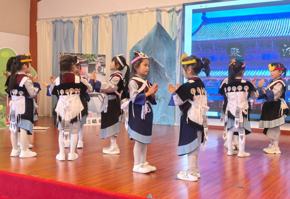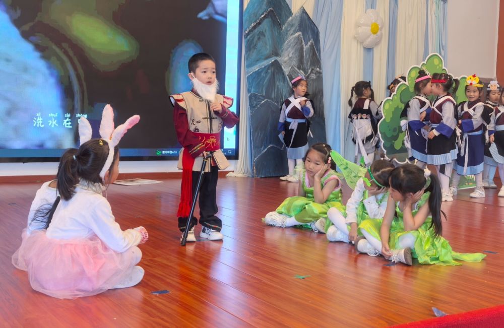 在玉龙县小精灵礼仪幼儿园的报告厅内,24名小朋友身着演出服装,伴着欢快旋律,通过儿歌传唱、情景舞蹈演绎纳西族与万物共生的古老故事。该县选送的童话剧《玉龙寻志》以“法治+艺术”为核心,将纳西族爱护环境、敬畏自然的传统智慧,转化为童趣满满的舞台场景,既保留东巴文化特色,又贴合幼儿表演特点。
