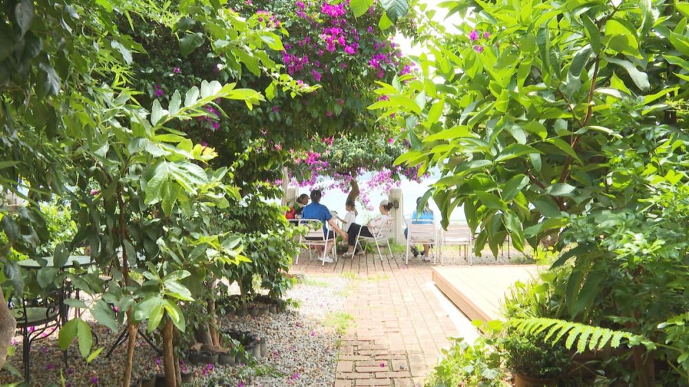 游客在永胜县程海镇潘崀村的观景餐厅内小憩。(丽江融媒记者 张丽瑶 摄)