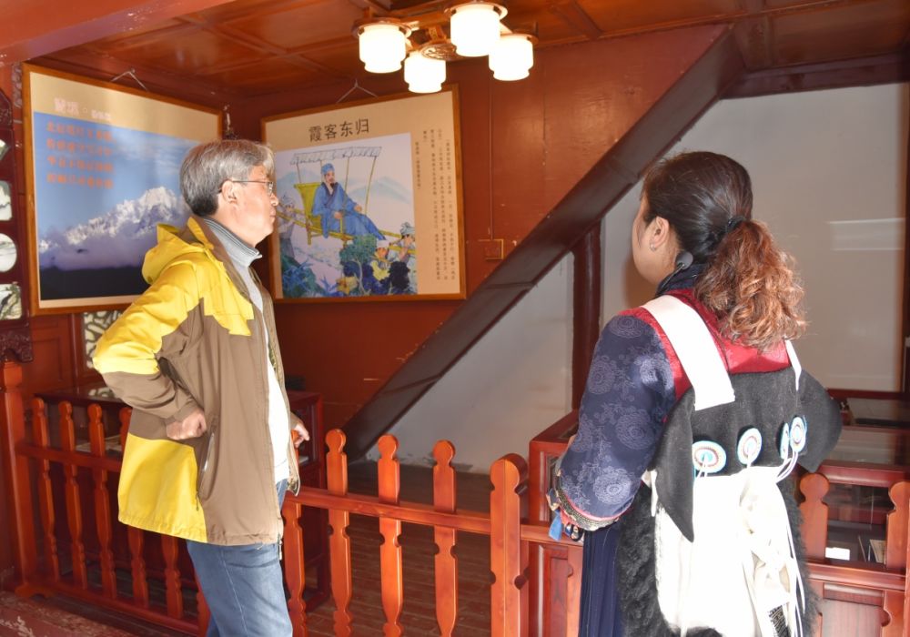龚学敏(左)在丽江古城博物院(木府)详细了解徐霞客与木氏土司的往事。(丽江融媒记者 段玉菊 摄)