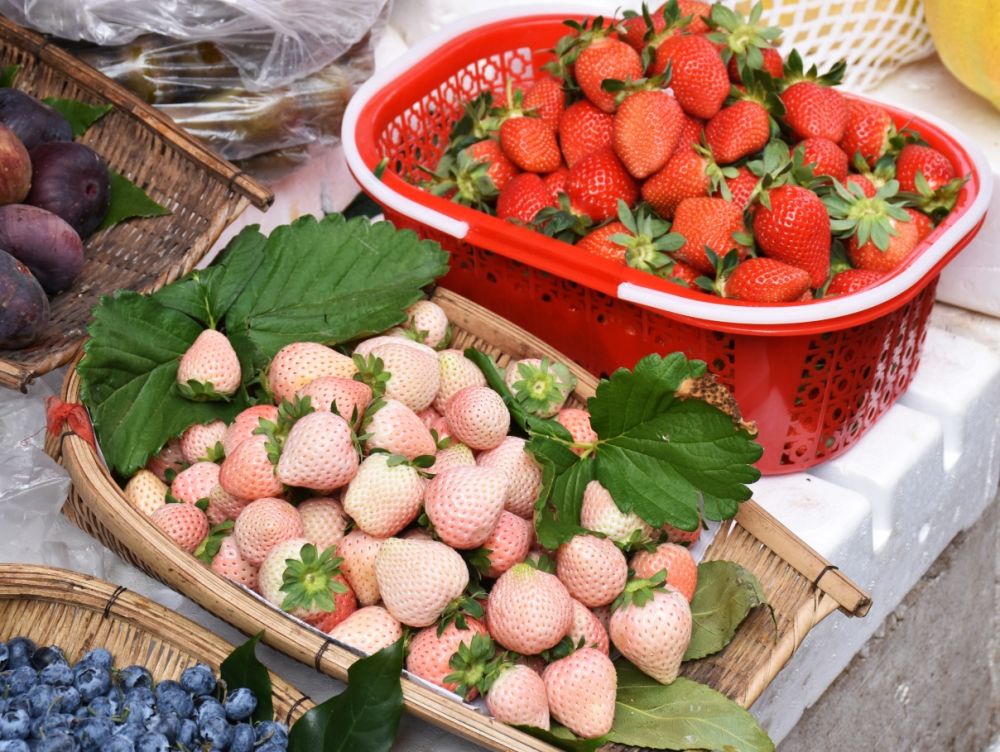 新鲜上市的“白雪公主”和“牛奶草莓”。(丽江融媒记者 杨四娟 摄)