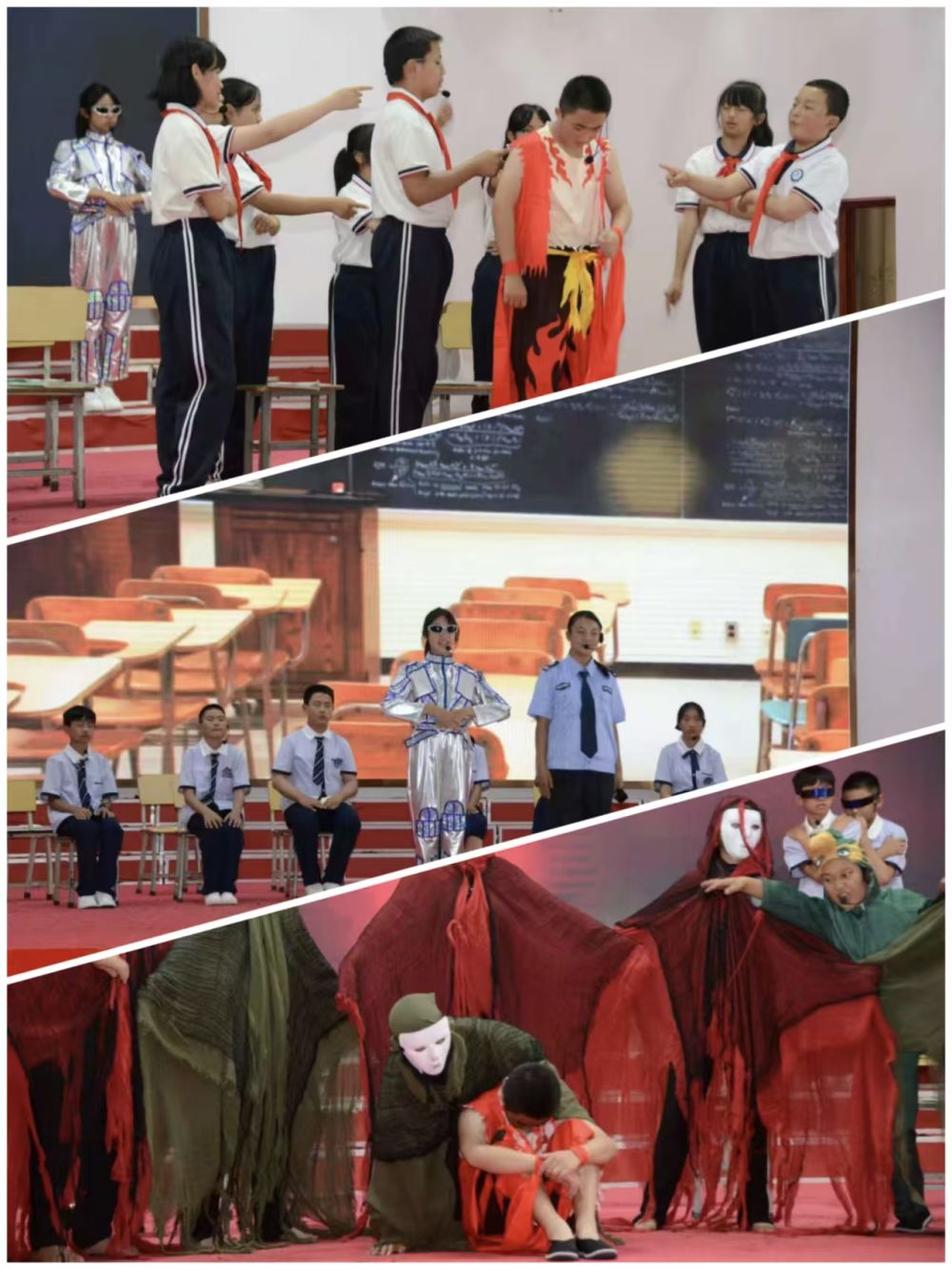 排练现场,七年级116班的谭韩成正与“太乙真人”对戏,“我要通过演好哪吒,让观众懂得遇事要找法律帮忙。”他说。一旁饰演“警官”的同学田圆谈及角色时眼中闪着光:“警官是正义的使者,我要让大家知道守规则、做好少年的重要性。”饰演“太乙真人”的学生自带萌点,现在他已从初时羞涩不知如何诠释角色的新手,变成了能用独特方式演绎喜感十足的“小太乙”。