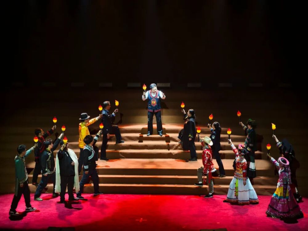 演出尾声,当毛建忠完成第一千场普法宣讲的瞬间,各行各业的法治工作者纷纷举起火把,齐声喊出“我在这里”,熊熊火光连成一片红海,与开篇的火塘微光遥相呼应,寓意着法治精神在小凉山薪火相传、生生不息。