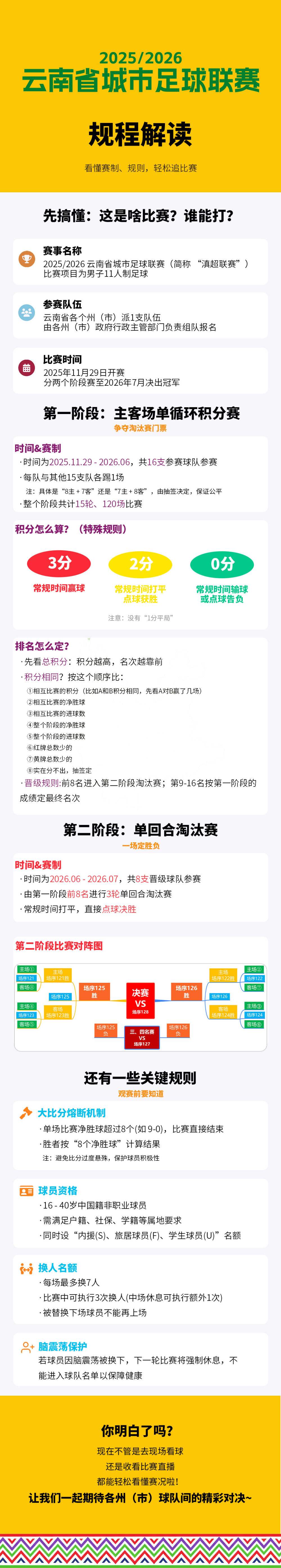 2025/2026云南省城市足球联赛(简称“滇超联赛”)将于2025年11月29日至2026年7月在云南省各州市举行,此次比赛集结了云南省16个州(市)的16支队伍,共有120场比赛,时间跨度长达8个月,揭幕战将于11月29日在玉溪高原体育运动中心开赛。从高原雪山到热带雨林,从峡谷之畔到广袤田园,16座主场、16支队伍掀起云南足球运动的热潮!这到底是啥比赛?谁能参加?赛制、规则又是啥样的?跟随新华网一图看懂赛程,轻松追比赛!(罗春明 丁凝)