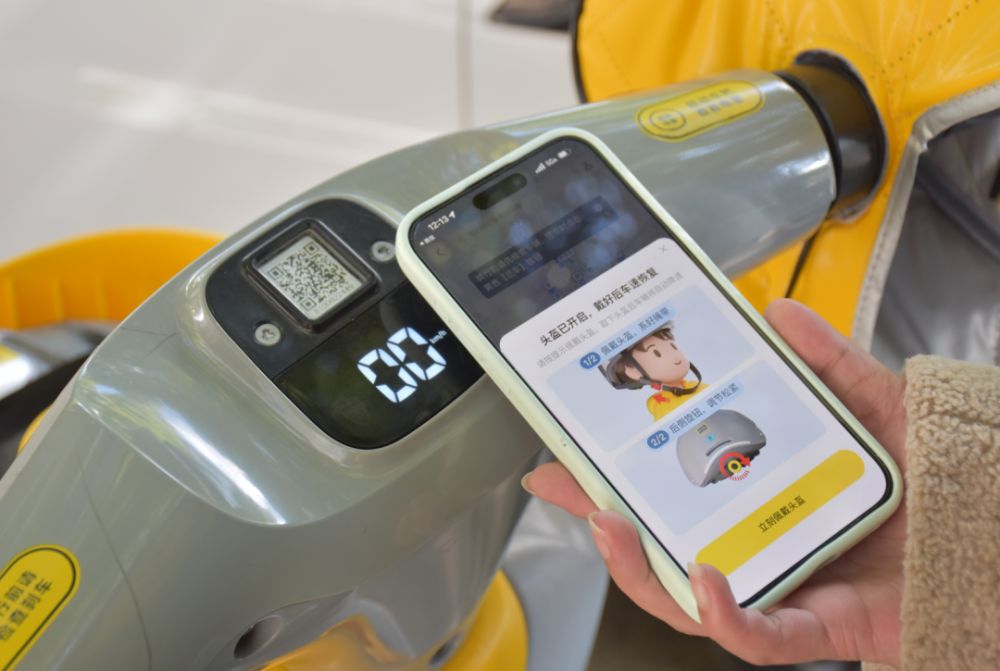记者实地体验发现,扫描美团电单车二维码后,车辆屏幕立即弹出“请佩戴安全头盔”的提示,此时拧动电门车辆无响应。点击该提示后,手机屏幕会详细展示头盔的正确佩戴方法,当骑行者规范戴好头盔后,车辆随即恢复供电,可正常调节车速。骑行结束还车时,系统会同步提醒及时归还头盔,形成安全闭环。这一智能防控措施的落地,为市民出行安全提供了重要保障。