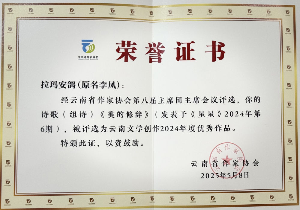 11月21日至24日,2025云南文学年会暨推动新时代云南小说创作出版系列文学活动在临沧举办。活动期间同步举行了云南文学创作2024年度优秀作品表彰仪式。丽江作家拉玛安鸽的诗歌《美的修辞》获云南文学创作2024年度优秀作品奖。