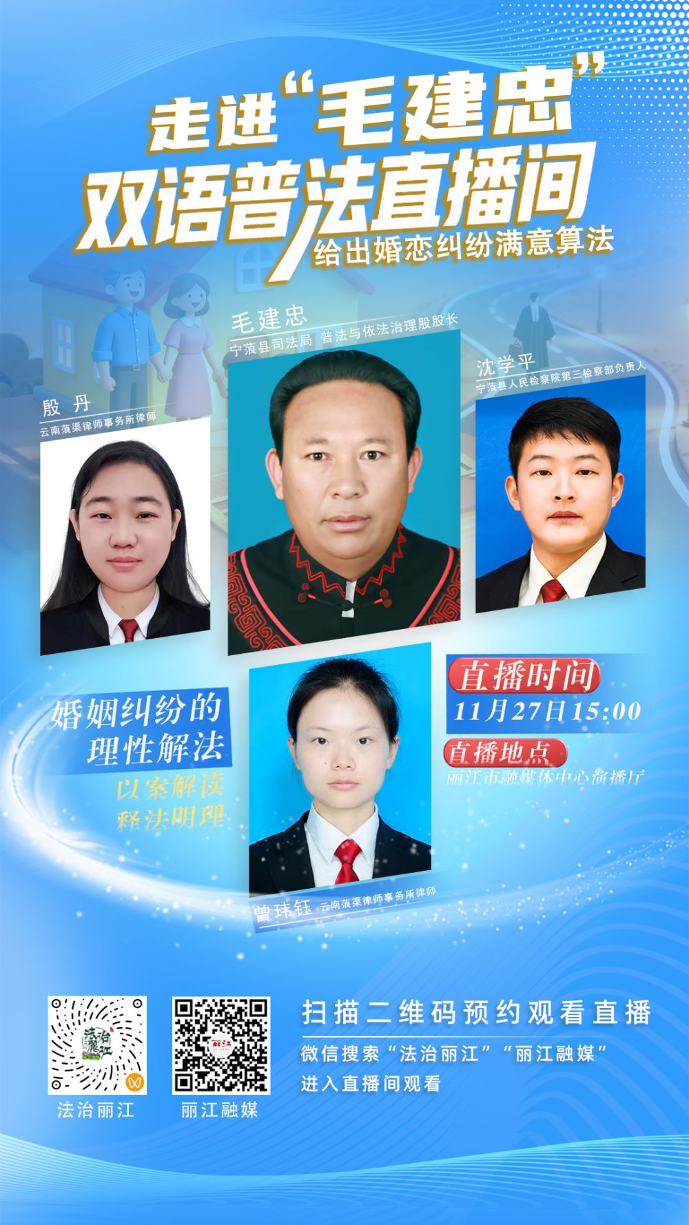 11月27日,宁蒗县司法局、宁蒗县人民检察院将联合云南蒗渠律师事务所,共同走进“毛建忠”双语普法直播间,聚焦婚姻家庭领域常见的法律问题,以案解读、释法明理的形式,将每个选择的成本与风险都讲透,让《中华人民共和国民法典》之婚姻家庭篇融入群众生活,为广大市民带来一堂生动的法治公开课。