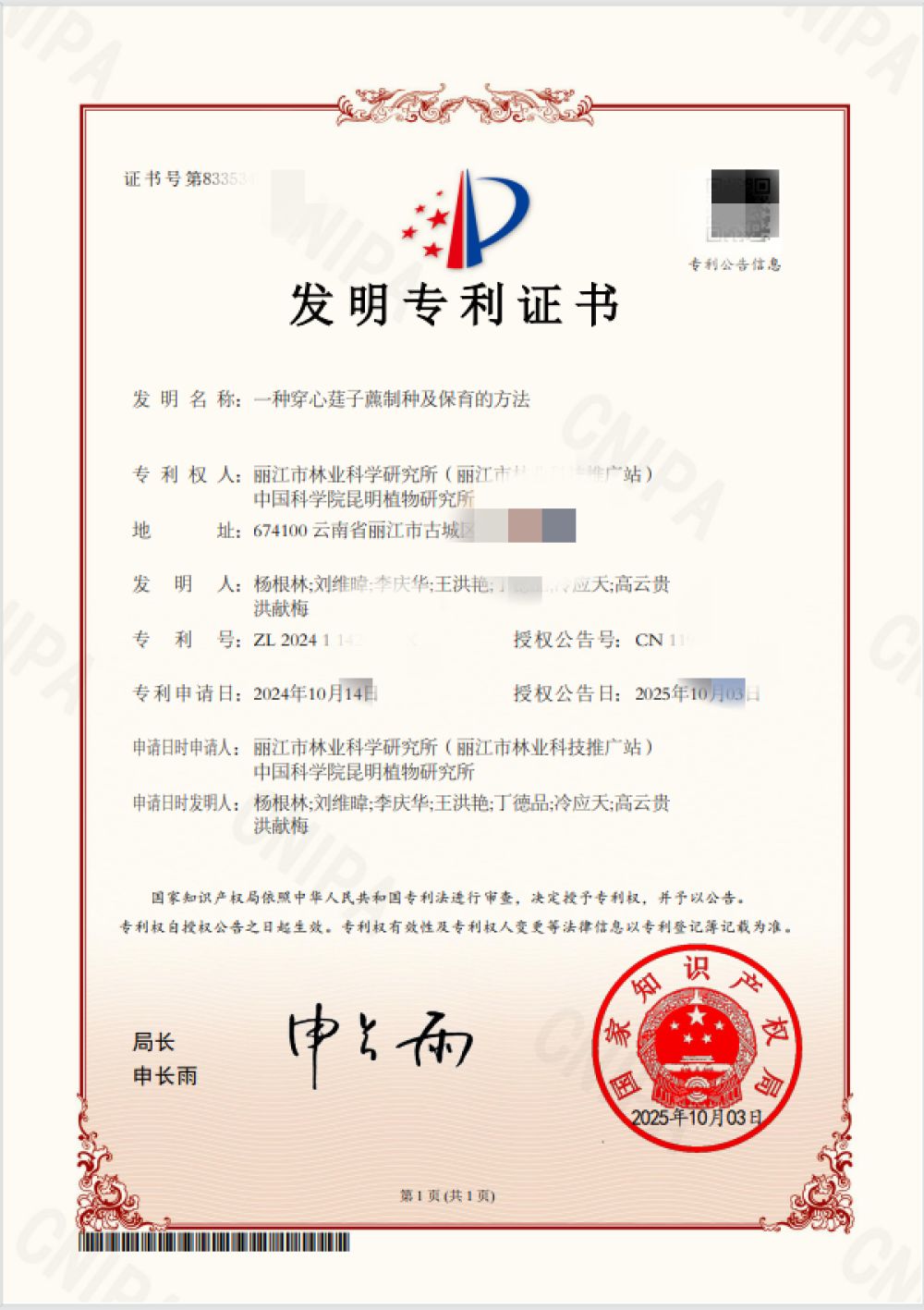 “一种大花刺续断的种植方法”“一种穿心莛子藨制种及保育的方法”两项发明,依托2025年度中央财政林草科技推广示范项目“滇重楼、滇黄精林下栽培技术示范推广”开展技术研发,使大花刺续断、穿心莛子藨苗木的培育成活率得到进一步提高,为开展林下种植及可持续利用提供种苗及技术保障奠定了基础,依托丽江独特的生物资源及民族医药文化,为充分挖掘高原特色药用植物作出了积极的贡献。