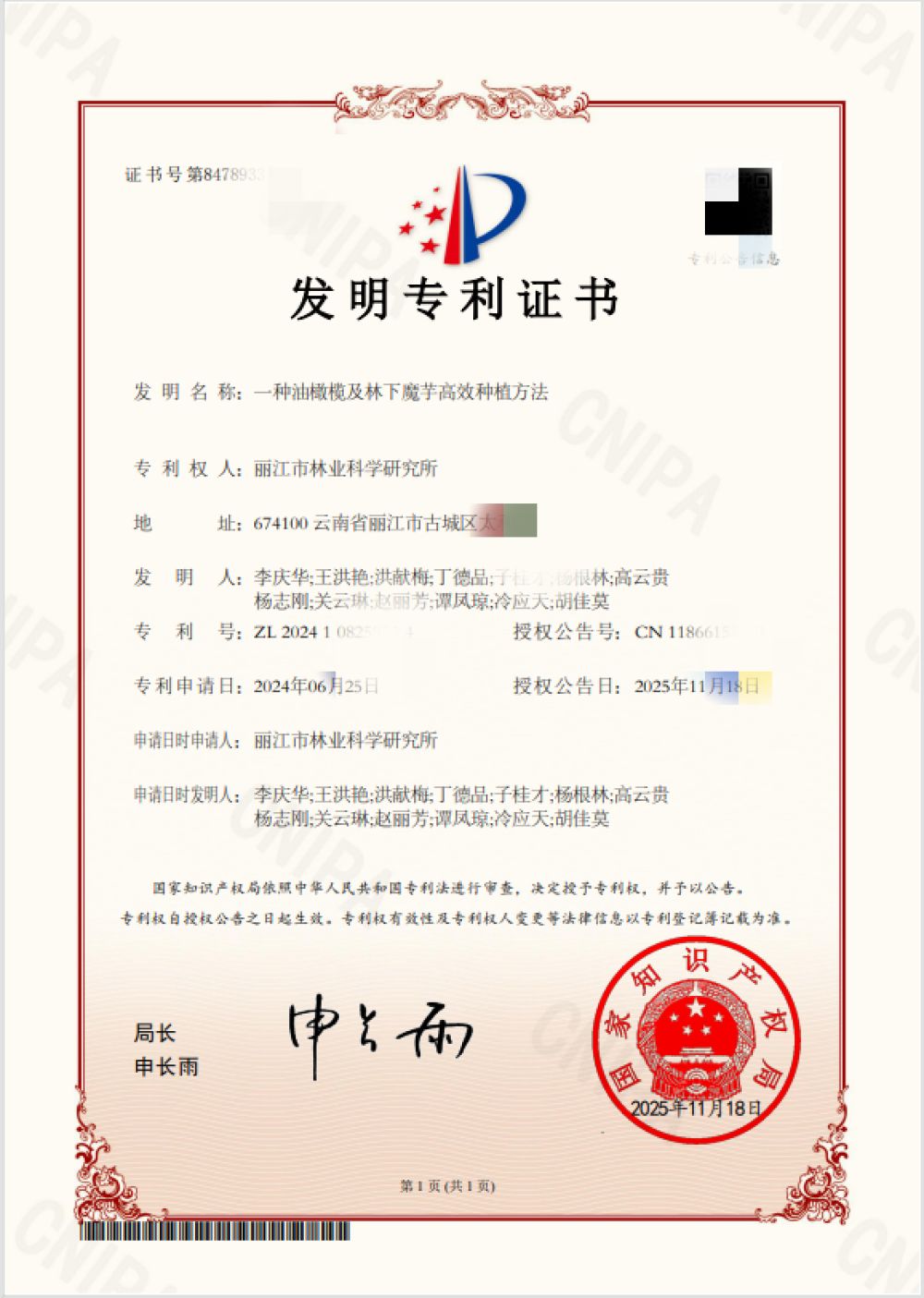 近日,丽江市林业科学研究所申请的“一种油橄榄及林下魔芋高效种植方法”“一种大花刺续断的种植方法”“一种穿心莛子藨制种及保育的方法”等3项发明专利获国家知识产权局授权。