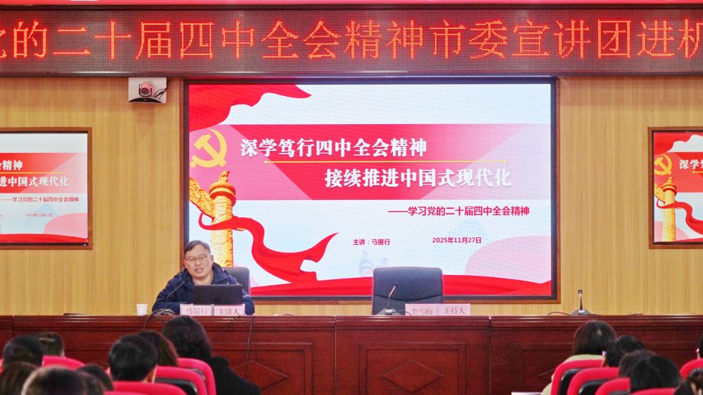 宣讲现场,市委宣讲团成员、丽江师范学院马克思主义学院党总支副书记、教授马银行以“深学笃行四中全会精神、接续推进中国式现代化”为主题,从“‘十四五’时期我国经济社会发展成绩单”“在历史交汇点上把握战略抉择的时代价值”“准确把握‘十五五’时期我国发展环境基本特征”等五个方面,对党的二十届四中全会精神作系统阐释与深入解读。宣讲紧扣主题,贴合国际国内发展大势与丽江实际,以鲜活案例、翔实数据为支撑,兼具理论高度与实践深度,为全市机关党员干部深学细悟全会精神提供清晰指引。