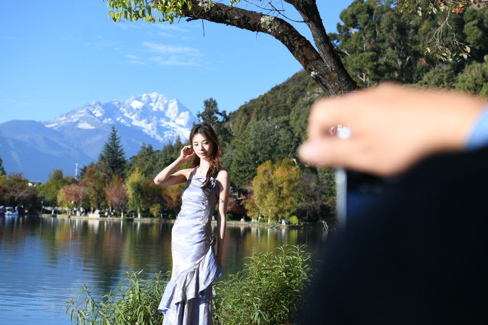 摄影师用手机在拍摄人像图片。(丽江融媒记者 赵庆祖 摄)