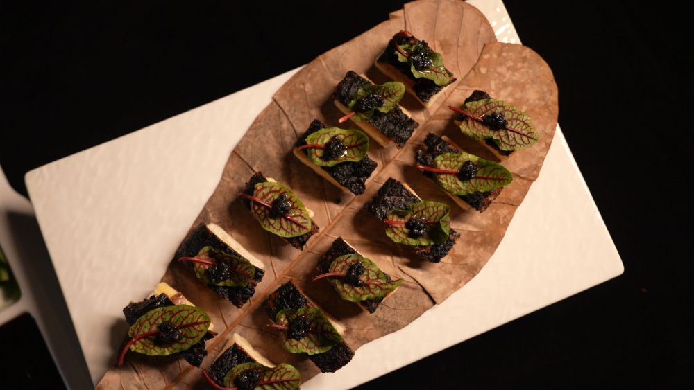 鸭皮点缀酸末叶搭配黑松露酱,碰撞出自然与古法融合的奇妙口感。