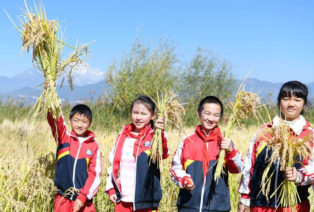 学生展示收割的稻谷。(丽江融媒记者 赵庆祖 摄)