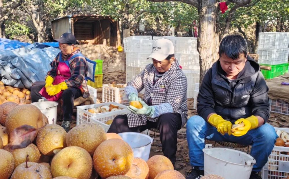 工人们正对采摘下的次果进行分拣处理,它们将被用于熬制梨膏。(丽江融媒记者 赵丽军 摄)