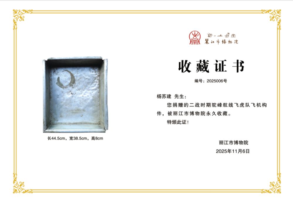 两位市民的善举并非个例。今年以来,丽江多位群众主动捐献珍藏:子国群捐赠的木雕麒麟,尽显传统木作工艺的精湛;和家康等人捐赠的金鱼刺绣帐帘,定格了近代民间生活的烟火气息;杨苏建捐赠的驼峰航线飞虎队飞机构件,见证了丽江与抗战历史的深厚联结。这些藏品虽非稀世国宝,却都深烙鲜明的“丽江印记”,为馆藏注入了鲜活的“百姓视角”。