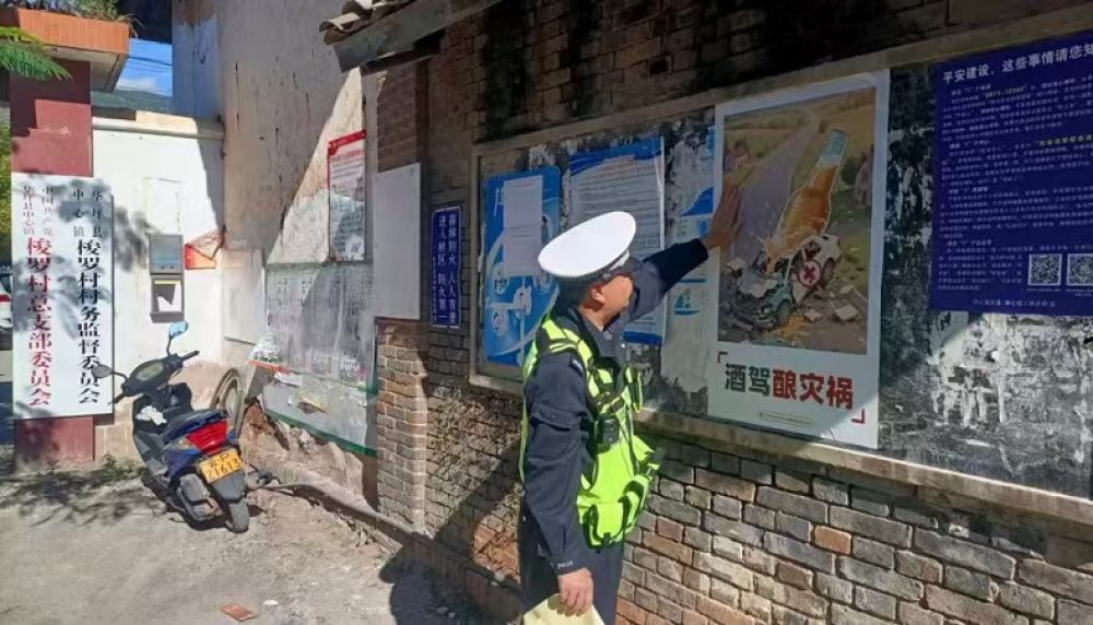 交警在乡村宣传栏张贴宣传画报。(交管部门供图)