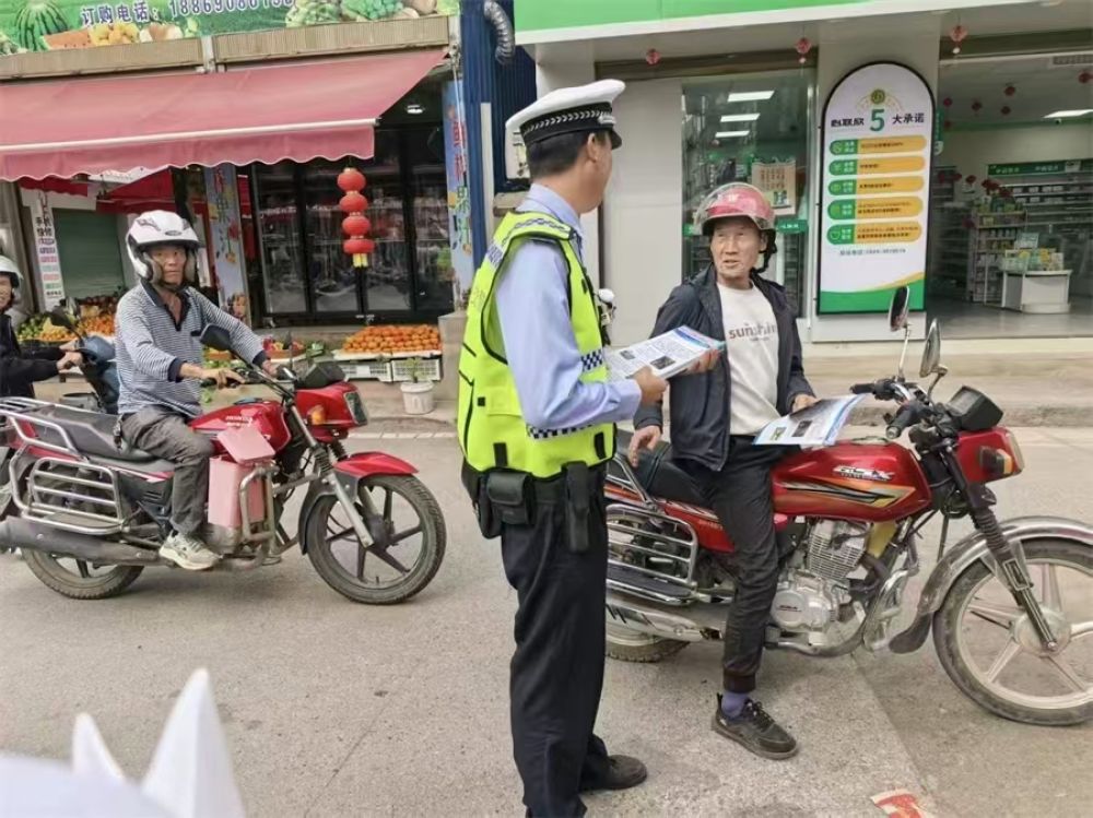 交警向交通参与者发放宣传资料。(交管部门供图)